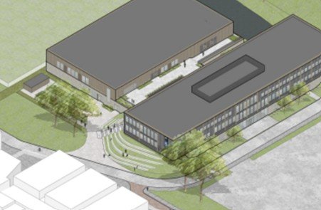 Het projectmanagement van het project Motion Beweegcollege komt langs om een voorlopig ontwerp te laten zien van de openbare ruimte rond de nieuwe school.